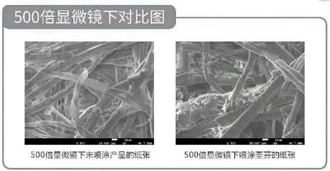 500倍顯微鏡下 紙張噴涂荃芬產(chǎn)品前后效果