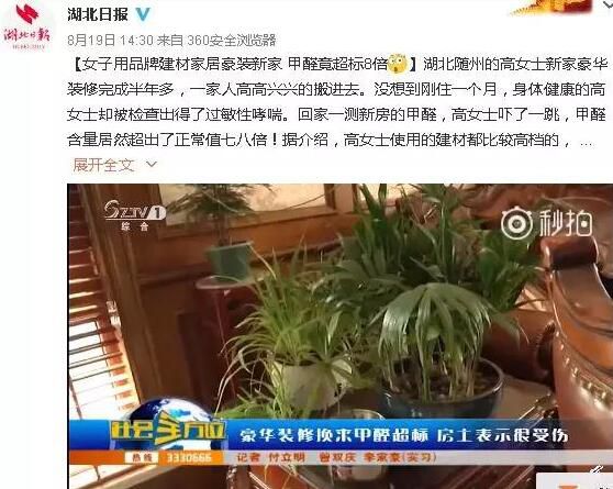 8月3日上午,又一個讓潘瀅慧家人吃驚的消息傳來,原來,江蘇省某專業(yè)檢測中心對她家的臥室進行了檢測,結果顯示,這個裝修了7年多的房子里甲醛依然超標:潘瀅慧居住的房間和其他家人所住房間甲醛含量分別達到0.117mg/m3和0.109mg/m3,而國家標準是小于或等于0.10mg/m3。 得到檢測結果后,老潘準備連夜將孩子們的物品從房間里轉移,10來月大的小孫女也不能繼續(xù)住在這個房間里了,可大人住的房間甲醛含量也超標,今后一